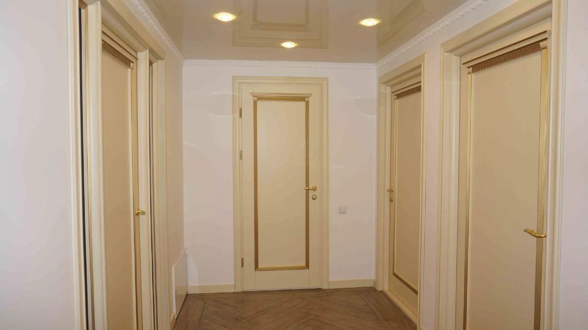 Кремовые стены, бежевые двери, ореховый ламинат — классический набор. Выглядит аккуратно, но устарел уже лет десять назад. Если тут еще и потолки многоуровневые, а в гостиной стоит стенка с хрусталем — да, ремонту точно лет 20.