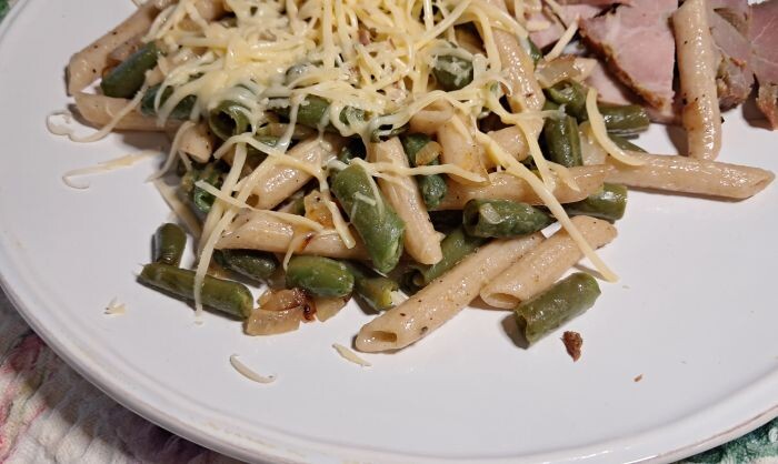 Макароны из полбы. Приготовила со стручковой фасолью. Ничего так, вкусно