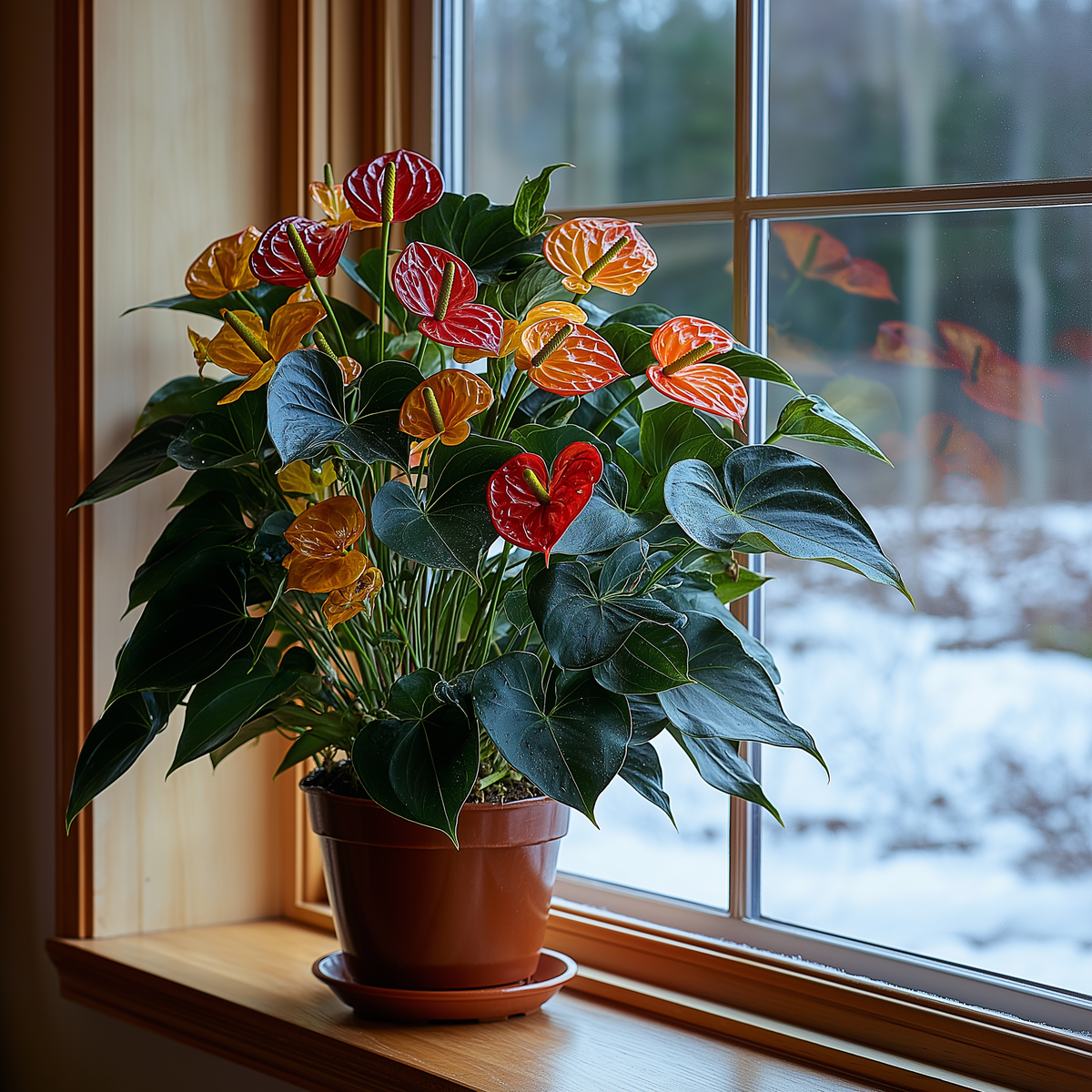 Зима для антуриума — период непростой. Мало света, воздух сухой, от окна тянет холодом. Но если правильно ухаживать, он будет цвести вопреки всему! Что нужно для цветения антуриума зимой Свет Это первое, о чем нужно позаботиться! Лучше всего поставить его на светлое место, идеально — восточное или западное окно. Если южное — притените от прямых лучей. Если света мало, цветения не ждите. Можно включать фитолампу на несколько часов в день. Полив и влажность Поливаем только теплой водой, которая отстоялась, когда земля сверху подсохла на пару сантиметров. ❗Перелив недопустим! Поставьте увлажнитель воздуха или горшок на поднос с влажным керамзитом. Опрыскивайте пространство вокруг растения, но не сами листья и цветы, иначе могут появиться пятна. Температура Самое то для него — +18…+22°C. Оберегайте от сквозняков и жара от батарей! Если подоконник холодный, что-нибудь подложите под горшок, подойдет пенопласт или плотная ткань. Удобрение Если антуриум в цвету, подкармливайте раз в месяц,