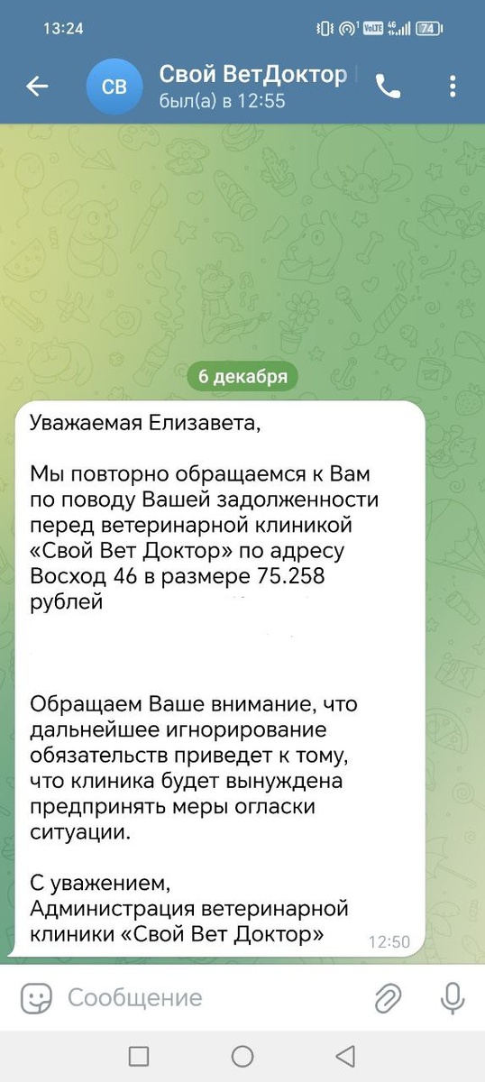 "Лапе в ладошке" нужна срочная помощь‼️ Ещё одно предупреждение по поводу оплаты задолженностей в клинике "Свой ВЕТ Доктор" 💔 В данной клинике сохраняется долг 75258 ₽ - средств на оплату не хватает в связи с огромным количеством расходов 💔 У нас есть время полностью погасить долг до Нового года - чтобы у нашего руководителя не образовалось в связи с этим дополнительных проблем. Убедительно просим каждого из вас принять участие, и совершить донат по ссылке ⚡ clck.ru/3PoBTB #лапавладошке #lapa_vladoshke #нужна_помощь_lapa_vladoshke