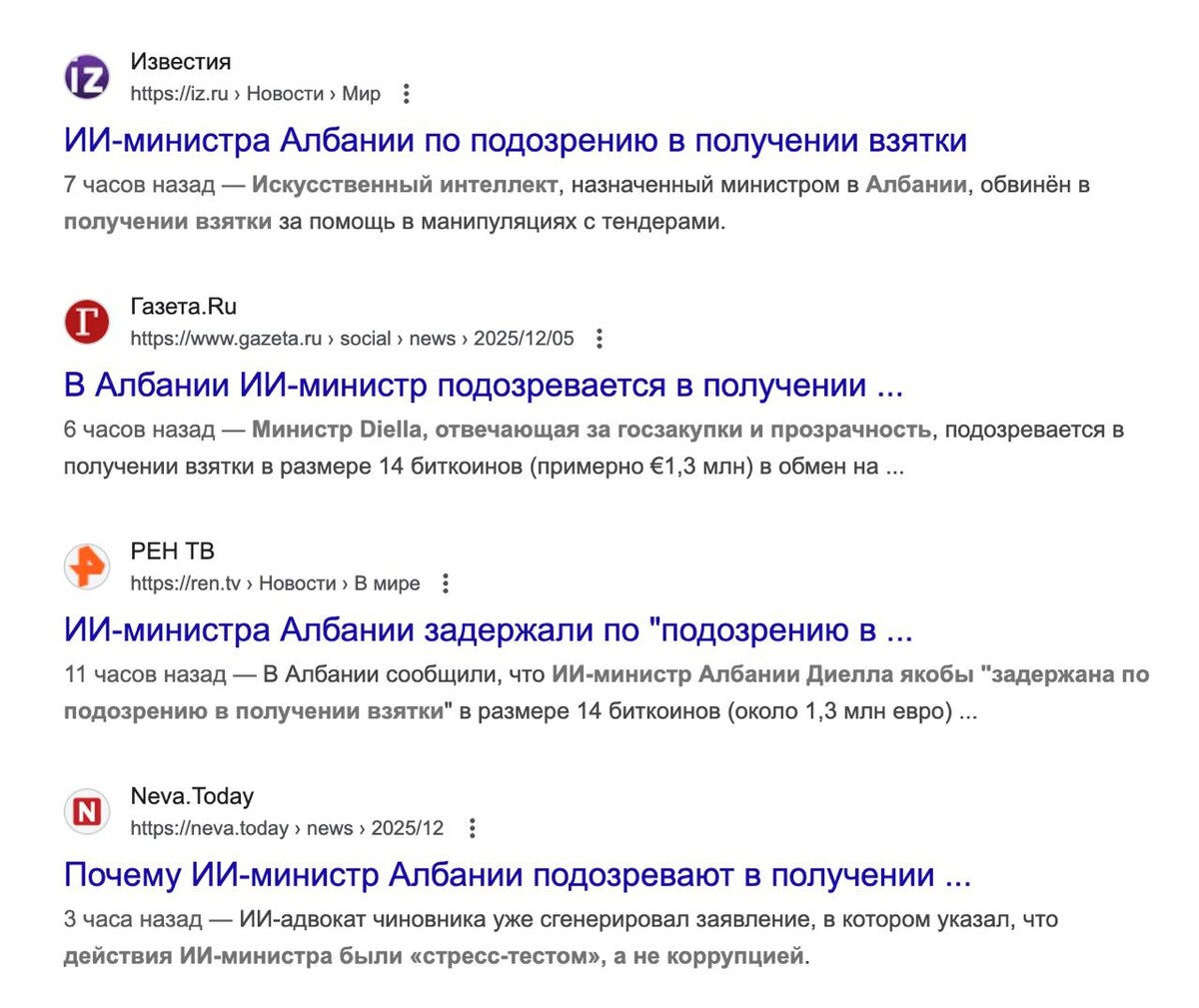 Интересно, ребят, а вам вообще всё равно, что вы пишете в официальных изданиях? У нас вроде законы есть о фейках. Ладно, когда в телеге кто-то обосрался, но вас же читают миллионы людей и платят вам миллионы из гос.бюджета. Для контекста: вчера многие СМИ, в том числе и такие глыбы, как «Известия», написали, что ИИ-министра Албании задержали по подозрению в получении взятки в криптовалюте. Якобы ИИ получила 14 биткоинов. Сделали это наши СМИ со ссылкой на Newsbar (это хорватская «Панорама»). Мы последнее время наблюдаем, как у многих новостных изданий падает трафик, и кто-то связывает это с падением концентрации, кто-то с тем, что люди уходят в социальные сети, но как будто есть ещё одна причина, и она куда реальнее: люди устали читать откровенный булщит от тех, кто по сути является профессионалом. То есть из-за погони за цитируемостью индекс дерьма в современных СМИ вырос до такой степени, что человеку легче пойти тгшку почитать. Мы тут в телеге признаём, что торгуем не эксклюзивны