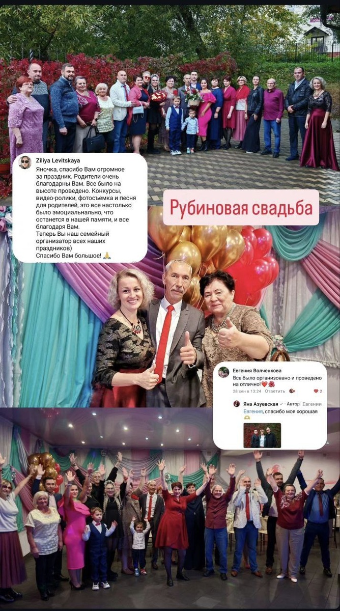 СВАДЕБНЫЙ ЮБИЛЕЙ Моя работа - дарить радость людям на важных событиях их жизни, будь то свадьба, юбилей или любое другое торжество. Но особое удовольствие приносит участие в организации и проведении свадебных юбилеев. ⭐️ Только представьте: спустя годы снова почувствовать себя молодоженами, услышать традиционное "горько" от детей и внуков... Это трогательно, искренне и незабываемо! В 2025 году отметила вместе с вами Серебряную (25 лет) и Рубиновую (45 лет) годовщины любви и верности. В прошлые годы вела Золотые юбилеи - 50 лет вместе! ❤️ Если хотите сделать ваш праздник особенным, запоминающимся и наполненным положительными эмоциями, обращайтесь. Создам уникальную программу специально для вас, учитываю ваши желания и предпочтения, подарив яркие впечатления и теплые воспоминания на всю жизнь. Давайте сделаем ваш день волшебным вместе! ⎯⎯⎯⎯⎯⎯⎯⎯⎯⎯ Ваш ведущий праздников #ЯнаАзуевская Тел.: +79036481020 группа VK: https://vk.com/yana_azuevskaya?from=groups