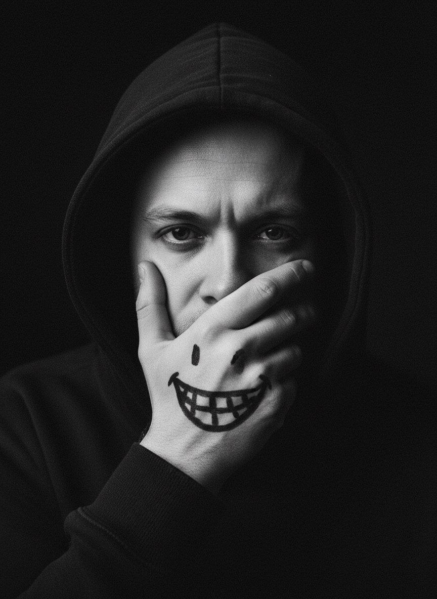 Промт и боты Nano Banana👇👇👇 https://t.me/nanobanana_promt/23 https://dzen.ru/nanobanana_promt Создай портрет, не меняя черты лица. Монохромный портрет крупным планом (close-up) молодого мужчины в капюшоне. Его правая рука закрывает нижнюю часть лица, а на тыльной стороне ладони черным маркером нарисована широкая, зловещая улыбка. Глаза мужчины выражают печаль или скрытую боль, в то время как рука "улыбается". Высокий контраст, глубокие тени и свет. Изображение в стиле арт-фотографии, зернистость, кинематографический свет.Драматическое освещение, глубокий фокус, минимализм.