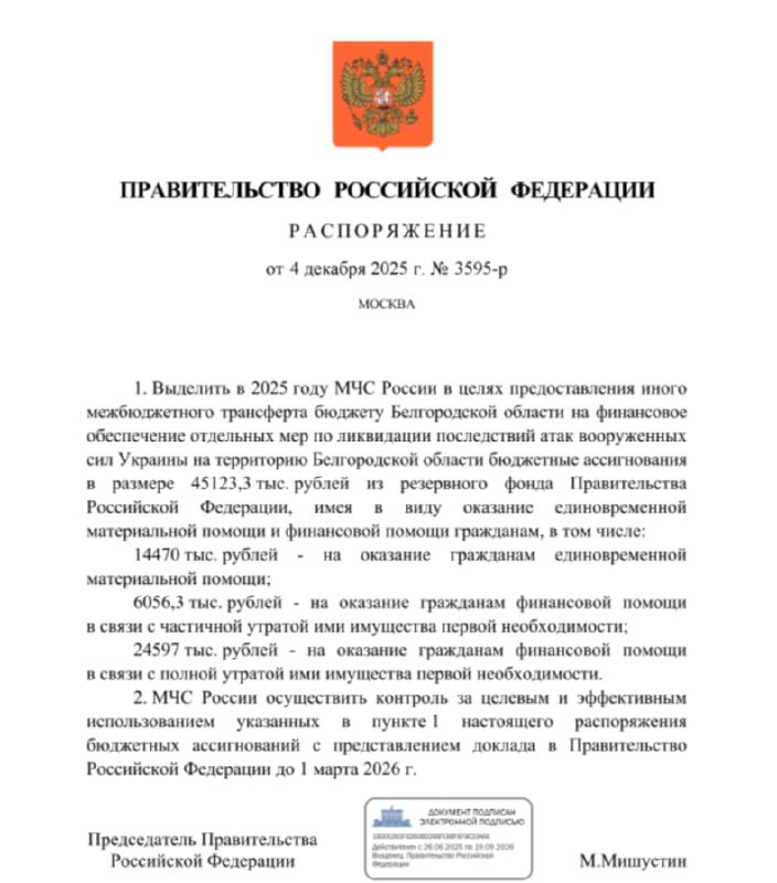 ✔️✔️✔️ Правительство РФ выделило более 45 млн рублей потерявшим из-за атак ВСУ жильё белгородцам
