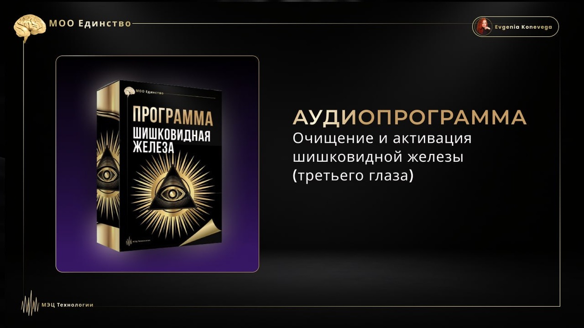 Как "Третий Глаз" управляет вашим успехом и долголетием Что отличает по-настоящему успешных, энергичных и счастливых людей от всех остальных? Ответ кроется не в банковском счете и не в удаче. 🧠Он спрятан глубоко в вашем мозге, в крошечной, но невероятно могущественной железе, которую называют шишковидной железой или эпифизом. Это не просто орган. Это ваш личный, встроенный в тело, "Третий Глаз", который тысячелетиями связывали с интуицией, высшим сознанием и духовным прозрением. ⚡️Сегодня наука подтверждает: его ценность для вашей повседневной жизни и уровня успеха абсолютно реальна и измерима. Шишковидная железа — это главный дирижер вашего внутреннего оркестра. Вы живете в идеальном ритме, легко концентрируетесь в течение дня. Это не мечта, это — прямое следствие здоровой работы эпифиза. Что вы можете сделать прямо сейчас, чтобы активировать свой "Третий Глаз"? ⚡️ПРИМЕНЯЙТЕ НЕЙРОАКУСТИЧЕСКИЕ ПРОГРАММЫ МЭЦ ДЛЯ ОЧИЩЕНИЯ И АКТИВАЦИИ ШИШКОВИДНОЙ ЖЕЛЕЗЫ