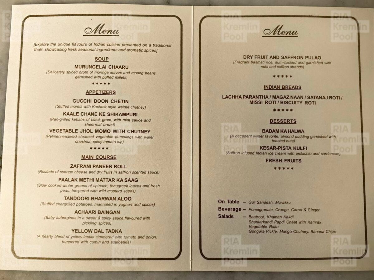 Госвизит президента РФ в Индию завершился, а нам все еще интересны детали. Особенно, госприем. Согласно протокольной традиции, речи лидеров раздают участникам приема. На втором фото как раз речь президента Индии. Бывает, кстати, что последовательный перевод не делают, так как текст на двух языках есть у всех участников. Индийский протокол пронумеровал все места за столом и номерки установлены рядом с кувертными карточками. В нашем протоколе есть тренд на отказ от нумерации мест и столов. В практике президентского протокола есть, например, опыт обозначения столов географическими названиями (см.фото «Байконур»). Ну а на государственном приеме в Индии российскую делегацию угощали вегетарианским ужином. Вот что было в меню: Легкий бульон из листьев моринги и бобов мунг, приправленный специями и украшенный просом. Фаршированные сморчки с чатни из грецких орехов, кебабы из черного нута с мятным соусом. Запеченный в тандуре фаршированный картофель с йогуртово-пряным маринадом и мини-бак