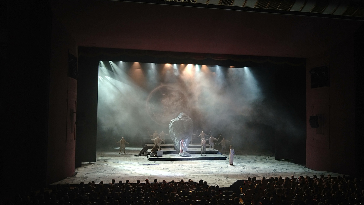 Но вот сцена изменилась. На ней появился гигантский обломок скалы - несомненно удачная находка. Стражи. Огромное пространство - только в эту секунду ты понемногу начинаешь понимать, КАКОГО размера эта сцена. И центральная фигура, болезненно завернувшаяся в белый плащ.