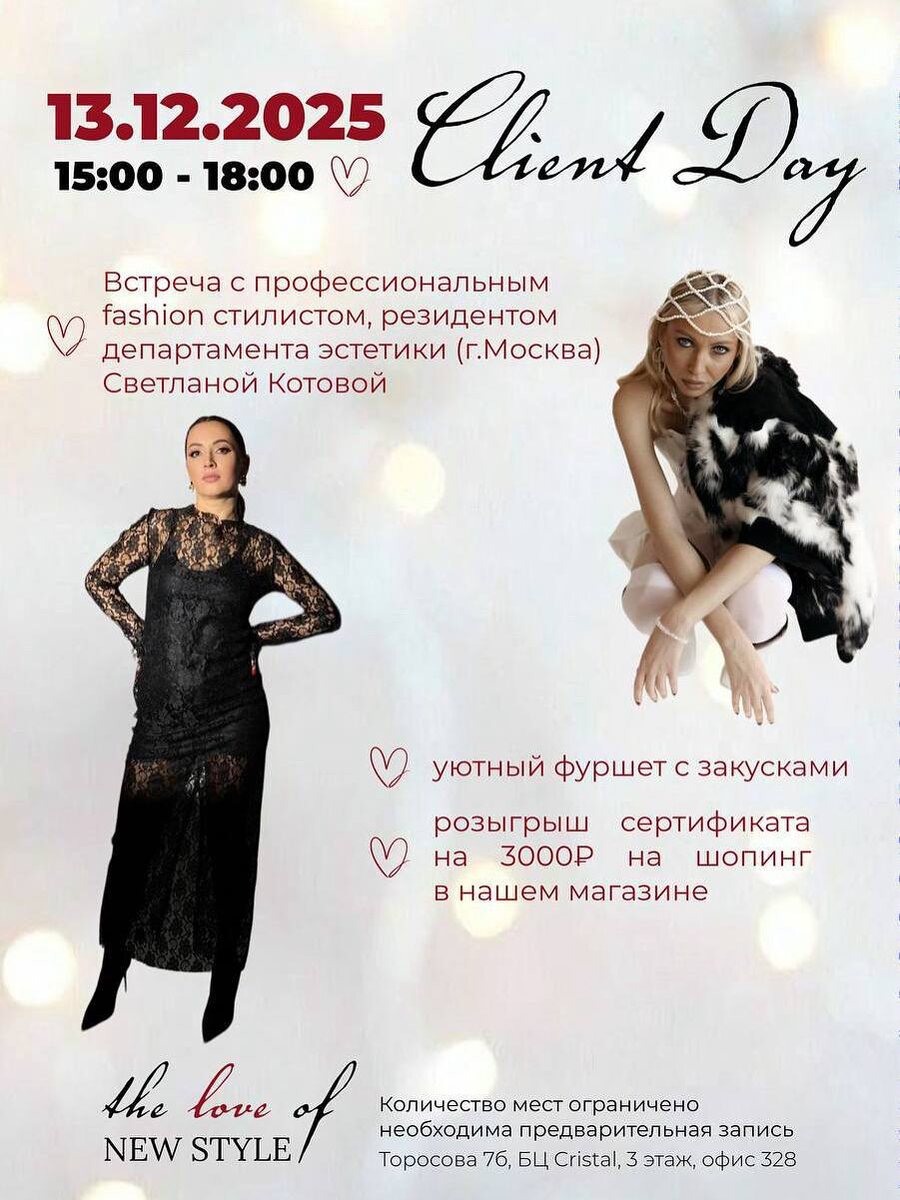 Client Day New style Наши друзья - магазин модной одежды New style приглашает Вас на клиентский день со стилистом. 13 декабря с 15:00 до 18:00 💫 встреча с профессиональным fashion стилистом, резидентом департамента эстетики (г.Москва) Светланой Котовой, которая поможет собрать новогодний образ мечты; 🥐 уютный фуршет с закусками, чтобы вы могли комфортно провести время и получить удовольствие от процесса; 🎁 розыгрыш сертификата на 3000 ₽ на шопинг в магазине New style — среди тех, кто воспользуется услугой стилиста и купит свой праздничный образ. Прекрасная возможность почувствовать себя особенной, спокойно пообщаться со стилистом, примерить новинки и заранее настроиться на прекрасный праздничный сезон. Количество мест ограничено — необходима предварительная запись @new_style19