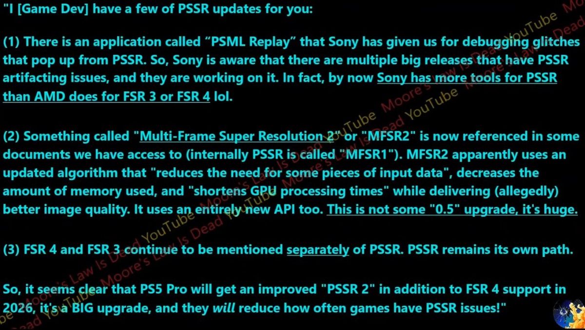 Апскейлер PSSR2 для PS5 Pro могут добавить в 2026 году вместе с поддержкой FSR 4. Один из разработчиков подтвердил, что Sony давно знает о проблемах артефактов в первой версии PSSR и активно их чинит — под это даже есть отдельное приложение PSML Replay для отладки. Внутри компании новая технология проходит как MFSR2 (Multi-Frame Super Resolution 2). Обновлённый алгоритм требует меньше входных данных, экономит память и снижает нагрузку на GPU. Плюс — новый API, благодаря которому картинка должна выглядеть заметно лучше.
