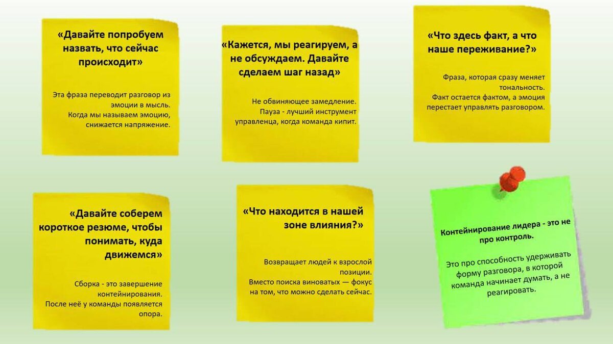 В ответ на пост Когда инструменты начинают жить у лидеров Недавно один из топ-менеджеров, читающий мой канал, прислал мне свою памятку - он собрал для себя фразы из моего поста о контейнировании и разместил их на рабочем столе. Он сказал: «Я стал замечать, как часто команда уходит в эмоции, и как иногда ухожу туда же я. Эти фразы помогут мне держать пространство». Мне всегда ценно видеть, как инструменты начинают жить в реальной управленческой практике и становятся опорой для лидера. Позднее поделюсь блоком вопросов, которые помогают самому лидеру контейнировать себя - когда эмоции усиливаются, а ясность падает. p.s. с разрешения моего читателя делюсь его заметкой, можете использовать😊