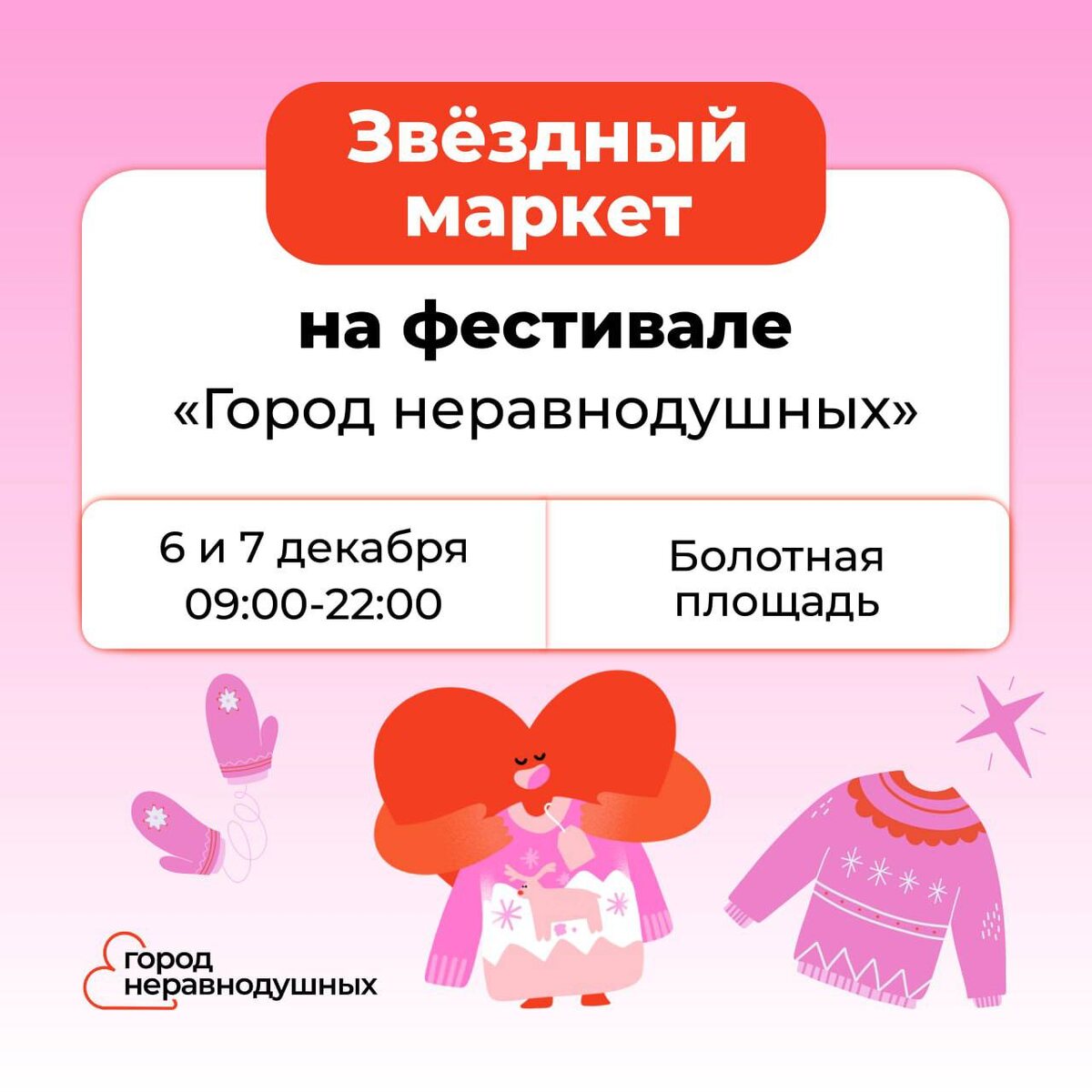 📍 Мы уже начинаем! Благотворительный фестиваль «Город неравнодушных» открыт! ♥️ Вас ждут зимние активности, ярмарка с новогодними сувенирами и звёздный маркет, мастер-классы, красочные фотозоны и много-много подарков! 📎 Не знаете с чего начать? Пройдите наш добрый квест «Лабиринт добра»! Вы прогуляетесь по всему маршруту фестиваля, окунетесь в мир добрых дел и получите подарки за участие. 📌 если вы не хотите приходить с пустыми руками — на фестивале будет бокс для настольных и карточных игр, которые мы передадим людям, проходящим лечение в госпиталях ✨ Вход свободный, подробная программа в карточках и на сайте Сегодня будет волшебно, ждём вас ❤️