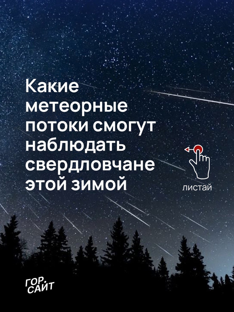 Какие звездопады украсят зимнее небо Свердловской области Этой зимой у свердловчан будет сразу несколько шансов загадать желание на падающую звезду. Небесное шоу обещают устроить три метеорных потока: яркие Геминиды, скромные Урсиды и новогодние Квадрантиды. Главные условия для успешных наблюдений — ясная погода, тёплая одежда и выезд подальше от городских огней. А чтобы точно не пропустить ни один звездопад, смотрите нашу удобную инфографику. Там мы собрали всё: даты, время пика активности и направления, куда стоит смотреть.