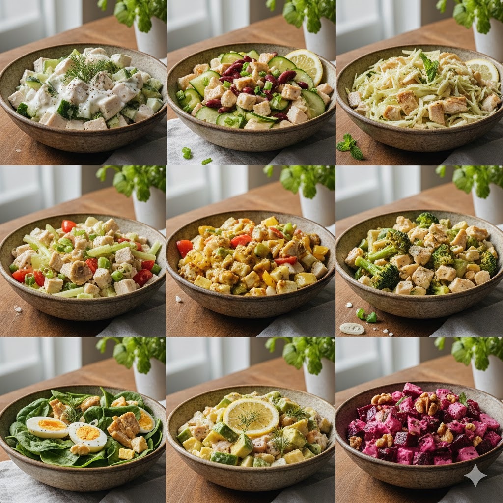 🥗 1. Курица + огурец + зелень + йогурт Ингредиенты: Варёная грудка — 200–250 г Огурец — 1–2 шт. Укроп/петрушка — по вкусу Натуральный йогурт — 2–3 ст. л. Соль, перец Как приготовить: