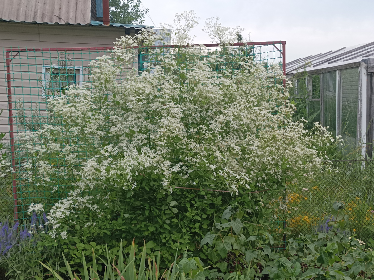 Пожалуй нет более загадочной культуры в моём саду, как клематис. На протяжении многих лет выращивания этой лианы я так и не нашла к ней подход. При более менее нормальном уходе клематисы могли расти и обильно цвести на протяжении нескольких лет, а потом выпасть без объяснимых причин. По количеству выпадов из всех растений сада за более, чем 15 лет, клематисы твердо идут на первом месте. И опыт выращивания в случае этой лианы не имеет никакого значения. А в моем случае получается как раз наоборот. С каждым последующим годом этих растений становится всё меньше, несмотря на посадку новых экземпляров. И вот, наступил сезон 2025 г. Если в конце прошлого года на зиму уходило 15 растений, то весной этого года проснулось только 6 шт. Из них 2 молодых, прошлогодней посадки и 4 уже довольно взрослых куста 6-9 лет. Клематис белый маньчжурский Ему уже 8-9 лет, самый неприхотливый из всех когда-то растущих моих клематисов. Зимует без укрытия стабильно хорошо, 3 гр. обрезки. Зацветает в середине июл