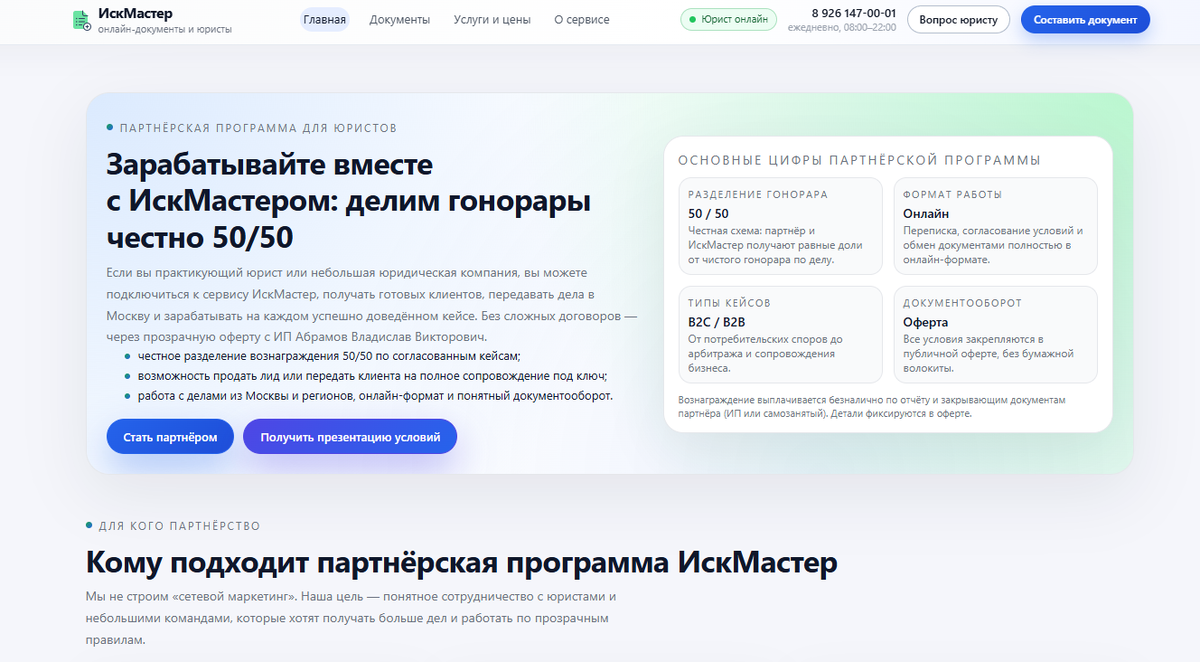 Одна из наиболее интересных и понятных моделей предлагает сервис ИскМастер, который специализируется на создании исков, претензий и других юридических документов онлайн. Для специалистов доступна расширенная партнёрская программа, позволяющая не просто привлекать клиентов, но и работать с переданными делами.