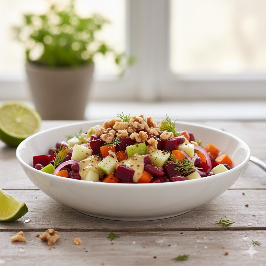 Сытный, яркий, полезный и полностью зимний по ингредиентам. Идеально к мясу, рыбе или просто как лёгкое самостоятельное блюдо. 🥘 Ингредиенты: Свёкла варёная или запечённая — 1–2 шт. Фасоль красная (варёная или консервированная) — 150–200 г Яблоко кислое (Грэнни Смит) — 1 шт. Морковь варёная — 1 шт. Красный лук — ½ шт. Грецкие орехи — 2–3 ст. л. Зелень — по желанию Заправка: Грецкий йогурт — 2–3 ст. л. Горчица — 1 ч. л. Лимонный сок — 1–2 ч. л. Щепотка соли Перец (по желанию) немного мёда — ½ ч. л. для баланса 🔪 Приготовление — подробно: 1. Подготовь свёклу Лучше использовать запечённую — она ароматнее.