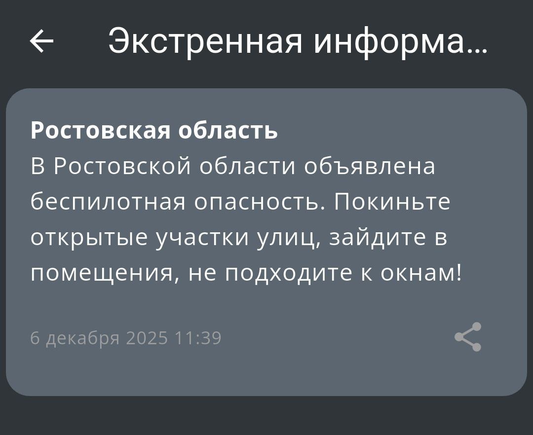 ‼️В Ростовской области объявлена беспилотная опасность Жителям порекомендовали покинуть открытые участки улиц, зайти в помещения и не подходить к окнам.