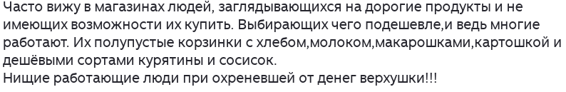 Что тут сказать? Очевидно, что автор приведенного выше коммента считает нищими людей, у которых "полупустые корзины", в которых лежат хлеб, молоко, макароны, картошка, курятина и сосиски (как подчеркивает комментатор, дешевые сорта). То есть, по сути, базовые продукты, необходимые для простого и здорового питания. Интересно, чтó, по мнению автора, должно лежать в корзинах "не нищих" людей? Может быть, мраморная говядина, телятина, салями, семга и осетрина, устрицы, фуагра и трюфели?