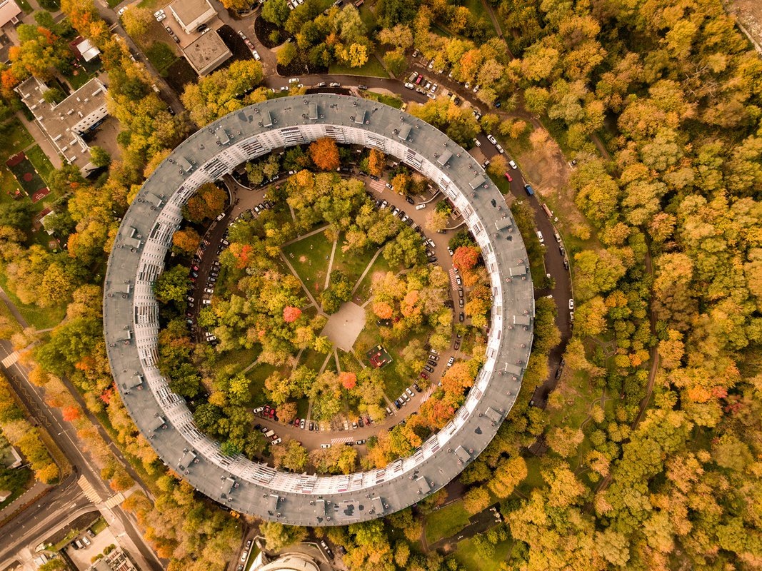 В западной части Москвы, в районе Раменки, расположены два уникальных жилых здания — круглые девятиэтажные дома, ставшие воплощением смелого архитектурного эксперимента 1970‑х годов. Их создали архитектор Евгений Стамо и инженер Александр Маркелов, объединив типовые элементы панельной серии I‑515/9M в необычную кольцевую конструкцию. Технические особенности проекта - Габариты: диаметр каждого здания — 155 метров.