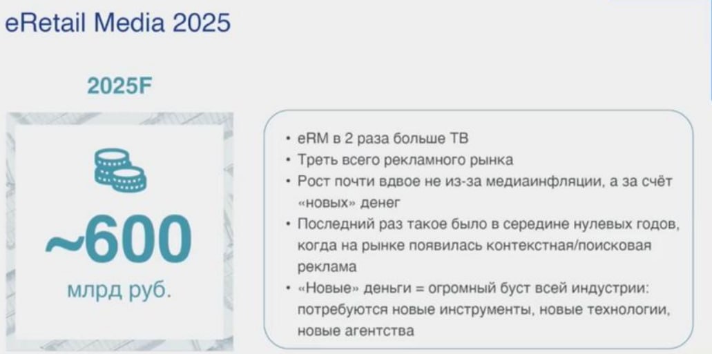 Российские ритейл-медиа выросли в 60 раз за четыре года - сигналит паблик о маркетинге и рекламе ADPASS. Объемы рекламы в российском e-com в 2025 году составят 600 млрд рублей, рекламодатели тратят на продвижение на цифровых и офлайн-площадках ритейлеров треть бюджетов. Сегодня рритейл-медиа — это треть рекламного рынка, которая возникла из воздуха за три-четыре года. В этих деньгах большая доля обязательного рекламного бюджета, который есть в условиях Wildberries и Ozon. В 2026 году, по консенсус-прогнозу ADPASS на основе усредненных оценок семи рекламных групп, рынок ритейл-медиа вырастет на 38%. Весь рекламный рынок будет расти вдвое медленнее. Его объем увеличится на 21% с учетом продвижения в e-com и на 12% без этого сегмента. Вообще, по логике, где-то там должны торчать уши каких-нибудь популярных медиахолдингов, представители которых гастролируют по мутным конференциям, собирая награды, и рассказывают, как всё в сфере радиовещания хорошо, вот посмотрите, нам вручили очередную