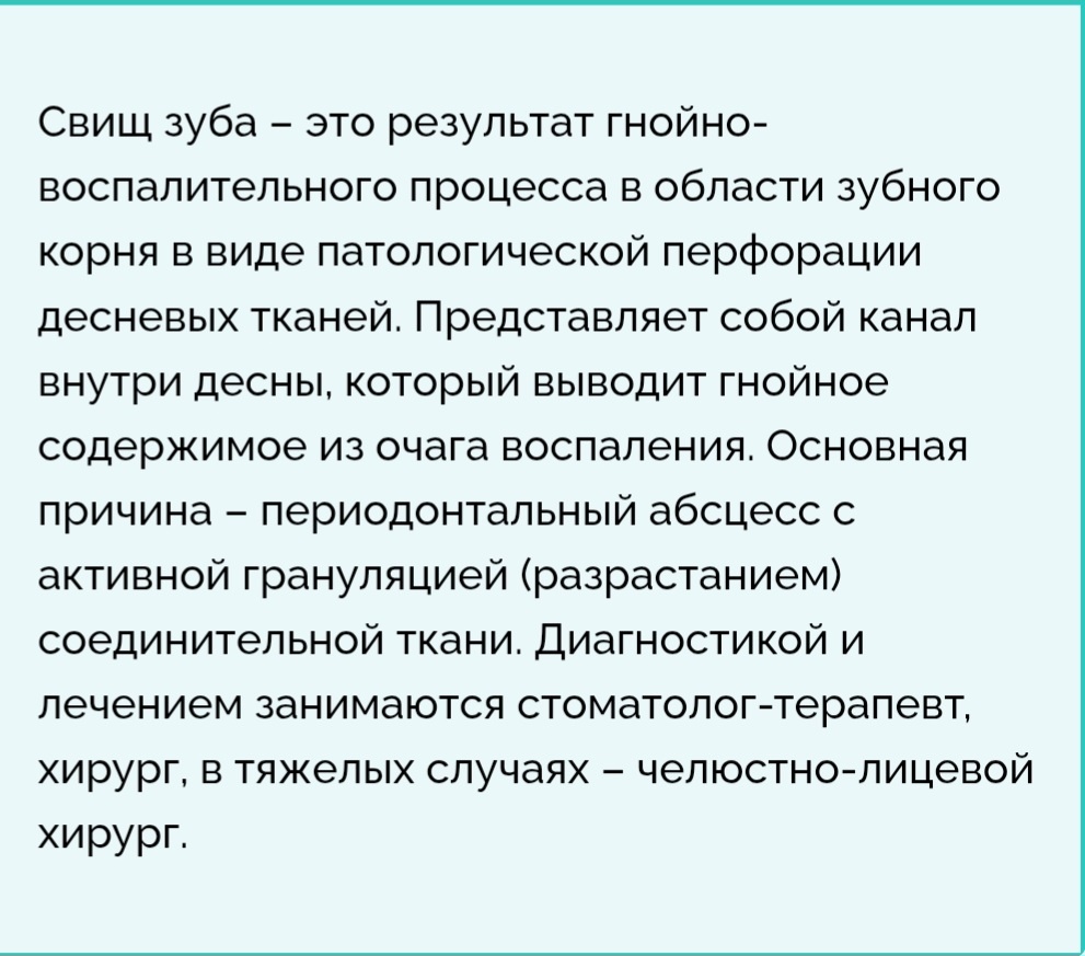 Всем доброго времени суток! У меня очень плохие зубы аричем с детства. Плохие зубы у мамы и у папы. Естественно в кого у меня будут хорошие? И сколько я себя помню вечно их лечили. Редко если у меня пропуск на несколько месяцев. В основном хожу лечить в государственную больницу, тем более стоматолог моя сестра. Она поставит хорошую пломбу и если не может помочь, то уже иду в платную. В нашей поликлинике очень хорошие стоматологи, им бы ещё аппаратуру хорошую и материалы. А то покупают материалы за свой счёт и естественно если пациенту нужна хорошая пломба, то делают за небольшую денежку. Ещё очень хорошие врачи педиатра и генекологи. Не смейтесь, лечится в нашу геникологию женщины приезжают из соседних районов. А нашему педиатру просто низкий поклон, святая женщина. Так вот образовался у меня на десне свищ. Вот такой же Стоматолог мой сказал полоскать для начала и если не пройдёт, то удалять скорее всего зуб. На зубе шрифт со временем из канала ушёл в десну и началось воспалени