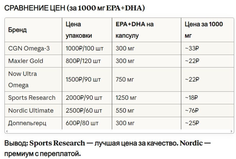 МОЙ ТОП-5: 🥇 Sports Research Triple Strength — лучшее соотношение цена/качество/концентрация 🥈 California Gold Nutrition — отличный бюджетный вариант 🥉 Now Foods Ultra Omega-3 — если нужна высокая концентрация дешевле 4️⃣ Nordic Naturals — если важен премиум и не жалко денег 5️⃣ Carlson Labs жидкий — если не переносишь капсулы РЫБА vs ДОБАВКИ: ЧТО ЛУЧШЕ? Рыба: ✅ Натуральный источник ✅ Дополнительный белок ✅ Другие полезные вещества ❌ Риск ртути и тяжёлых металлов ❌ Дорого есть каждый день ❌ Не всем нравится Добавки: ✅ Очищены от ртути ✅ Точная дозировка ✅ Удобно ❌ Это всё-таки БАД Мой совет: И рыба, И добавки. Рыба 2-3 раза в неделю + добавка ежедневно = идеально. Завтра: Мифы об омега-3 Омега-3 vs Омега-6 — война жиров Связь с волосами и кожей Мои наблюдения из практики Вопрос: Какую омега-3 ты принимаешь? 🐟 — из аптеки 🌿 — с iHerb 🏋️ — спортпит 🌱 — веганскую из водорослей ❓ — ещё не выбрала #омега3 #бренды #iherb #какВыбрать #рыбийжир #полезности #гайд