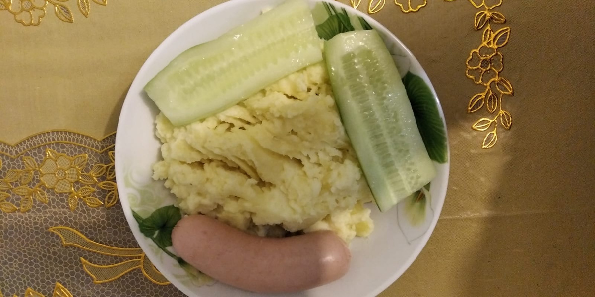 Приветики мои дорогие, как у вас дела? Ваша Тонечка наконец то на выходных, и отдыхать будет сразу 2 дня, так ещё и во всемирные выходные, субботу и воскресенье. Утром я сегодня вставать рано не хотела, но нужно было Гаврилу покормить, поэтому нехотя проснулась и пошла на кормежку. Потом домой вернулась и ещё досыпать легла, вообще я так очень редко делаю, потому что если уж проснулась, уснуть снова не могу, но в этот раз захотелось прям выспаться. Выспалась, и пошла завтрак себе готовить, вкусный и полезный. Точнее это уже и не завтрак был, а ближе к обеду, потому сначала выспалась хорошенько. Тут у меня пюре из картошки и одна сосиска с огурчиком. Пюре я вилкой мяла, потому что захотелось как толченную картошку, добавила чуть сливочного масла. Зелень в этот раз не добавляла, хотя она у меня есть в морозилке. Ну и конечно чай чёрный заварила и одну зефирку съела, но не совсем зефирку, а только дну половинку, правую. Я же сейчас на диете, много есть нельзя, стараюсь себя огранич