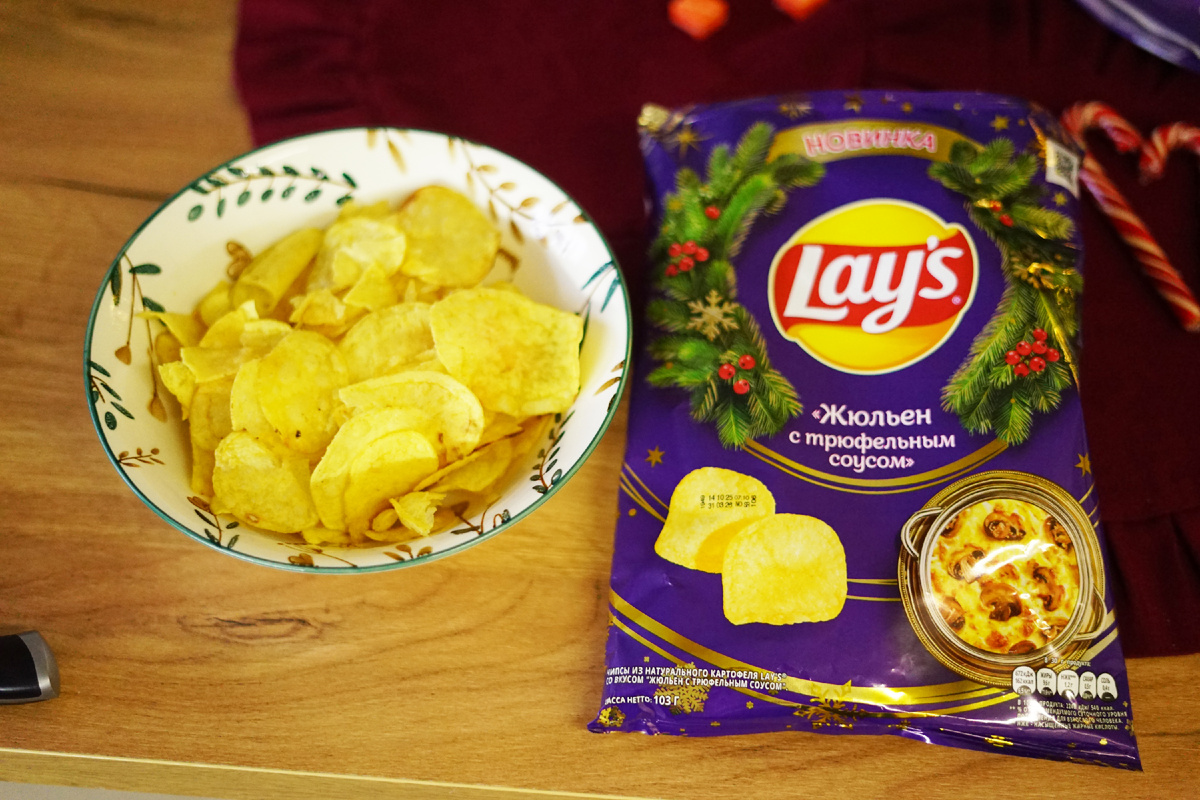 Кстати, этот сезон — настоящее раздолье для вкусовых экспериментов. Как отмечают эксперты, праздники — это время, когда мы особенно любим себя побаловать, и производители это знают. Вкусная еда становится важным источником удовольствия, и это чувство уюта и радости — именно то, чего мы все ищем холодными вечерами. Lays Жюльен с трюфельным соусом Упаковка сразу задаёт праздничное настроение: тёмно-фиолетовый фон, снежинки и еловые ветки. Картинка с аппетитным жюльеном и обычными, нерифлеными чипсинками. Внутри чипсы разного размера, но без лишней крошки и почти без «горелышей». При открытии — лёгкий, почти деликатный аромат картофеля с грибными и едва уловимыми сливочными нотками. Ожидания «жюльена» с курицей
