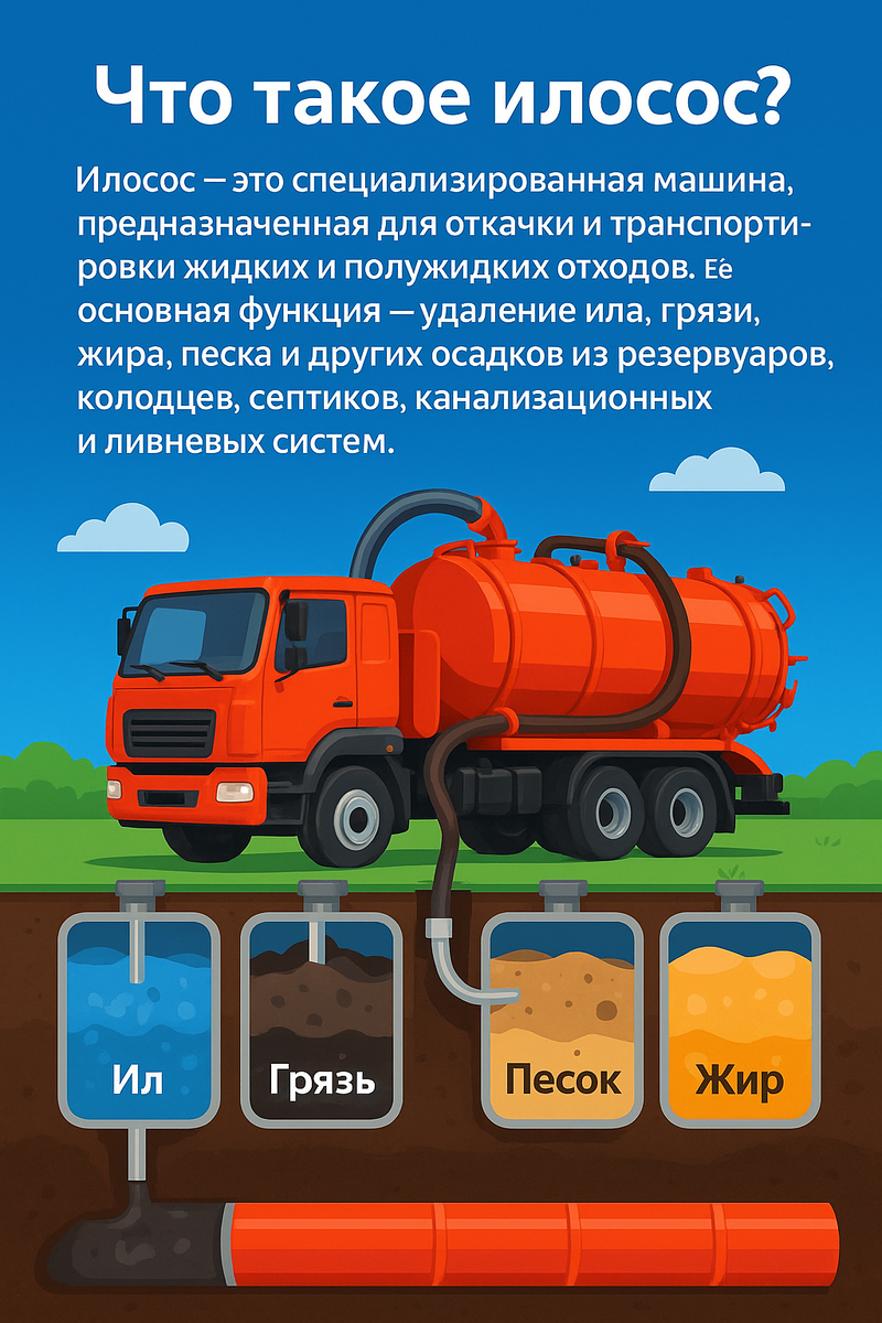 Современные технологии позволяют значительно ускорить и упростить обслуживание канализационных систем, ливневок и промышленных объектов. Один из самых эффективных инструментов в этой сфере — илосос. Несмотря на необычное название, это один из самых универсальных видов спецтехники, который применяется для очистки, откачки и профилактики инженерных коммуникаций. Разберём, что такое илосос, как он работает и почему его услуги необходимы как частным домам, так и организациям. Что такое илосос? Илосос — это специализированная машина, предназначенная для удаления и транспортировки жидких и полужидких отходов. С её помощью можно эффективно откачать: ил и донные отложения; жиры и вязкие массы; песок и грунтовый мусор; продукты жизнедеятельности; смесь после засорений или аварий. Илосос внешне напоминает ассенизатор, но оснащён значительно более мощным оборудованием. Ключевые элементы: вакуумный насос высокого давления — обеспечивает сильное всасывание; цистерна увеличенного объёма — для плот