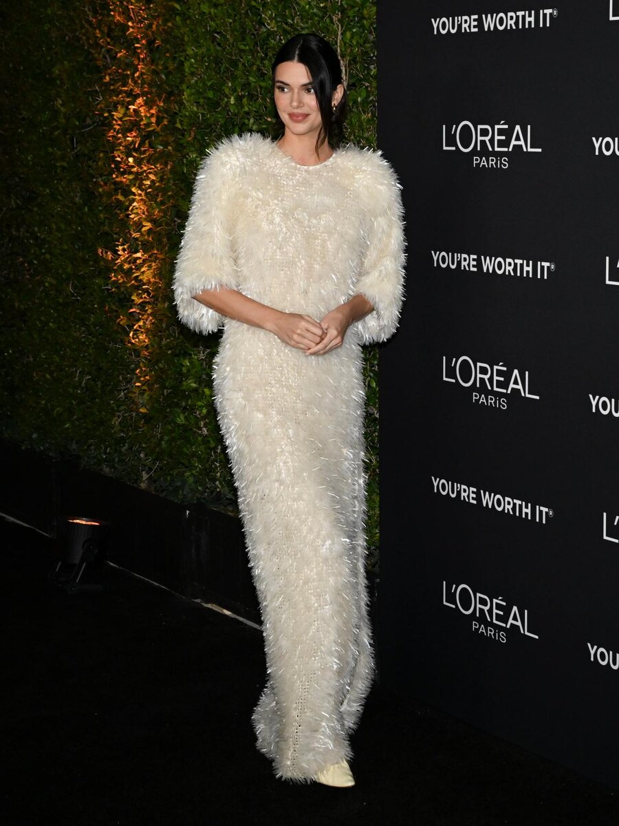 Кендалл Дженнер привлекла всеобщее внимание на праздновании 20-летия L’Oréal Paris Women of Worth, надев платье, которое выглядело как пушистое, украшенное перьями, но на самом деле его текстура была создана тысячами опалесцирующих бусин. 30-летняя супермодель прибыла в Академический музей кинематографии в Лос-Анджелесе в платье цвета слоновой кости из весенней коллекции Bottega Veneta 2026 года. Модель миланского бренда имела высокий разрез на ноге, рукава до локтей и круглый вырез. Звезда дополнила свой образ туфлями Sofia от Bottega маслянисто-желтого цвета и собрала темные волосы в свободную прическу. Стилист Дани Мишель, которая также работает с Хейли Бибер и Рози Хантингтон-Уайтли, подобрала образ для Дженнер. Они работают вместе с 2020 года. Платье дебютировало в сентябре во время Миланской недели моды в рамках первого показа креативного директора Луиз Троттер для итальянского дома моды. На подиуме оно было стилизовано с водолазкой и шелковыми шортами цвета слоновой кост