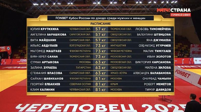 А параллельно следим за финальным блоком второго соревновательного дня FONBET Кубка России по дзюдо 🥋 ❗️ПОСТ ОБНОВЛЕН: женщины, до 57 кг: 🥇Вита Майданник 🥈Яна Джумаева 🥉🥉 Ангелина Барашкова, Юлия Крутихина женщины, до 63 кг: 🥇 Стефания Власова 🥈 Александра Балабанова 🥉 🥉 Виктория Карсанова, Милена Хилова мужчины, до 73 кг: 🥇Буян-Херел Санаа 🥈Иван Золотов 🥉🥉 Малик Тимухаев, Сейд-Магомед Угурчиев мужчины, до 81 кг: 🥇Тимур Давидов 🥈 Клим Калинин 🥉 🥉 Сайхан Шабиханов, Георгий Елбакиев Трансляция на канале Матч! Страна стартует уже сейчас, подключайтесь 📺