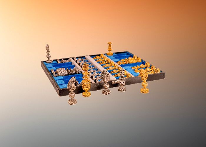 В Музее музыки хранится уникальный экспонат — драгоценный подарок, который музыкант-виртуоз Леонид Борисович Коган получил во время гастролей в Израиле в 1965 году. В деревянном футляре на синем бархате выложены шахматные фигуры невиданной красоты. Они как будто сплетены из тончайшего серебряного и золотого кружева. Глаза двух шахматных коней, серебряного и позолоченного, сделаны из крошечных кусочков синей и красной смальты, цветного непрозрачного стекла. Шахматы были изготовлены задолго до гастрольной поездки Когана и даже до образования государства Израиль. Этот единственный в своем роде комплект датируется 1912 годом. Его создал художник Борис Шац в Школе (ныне Академии) искусств и ремёсел «Бецалель» в Палестине. Борис Ильич Шац — человек удивительной судьбы. Уроженец Вильнюса, он учился в Париже в Академии живописи, а также у скульптора Марка Антокольского. Бронзовый портрет учителя стал лучшей работой Шаца парижского периода. Закончив обучение, мастер отправился в столицу Болгари