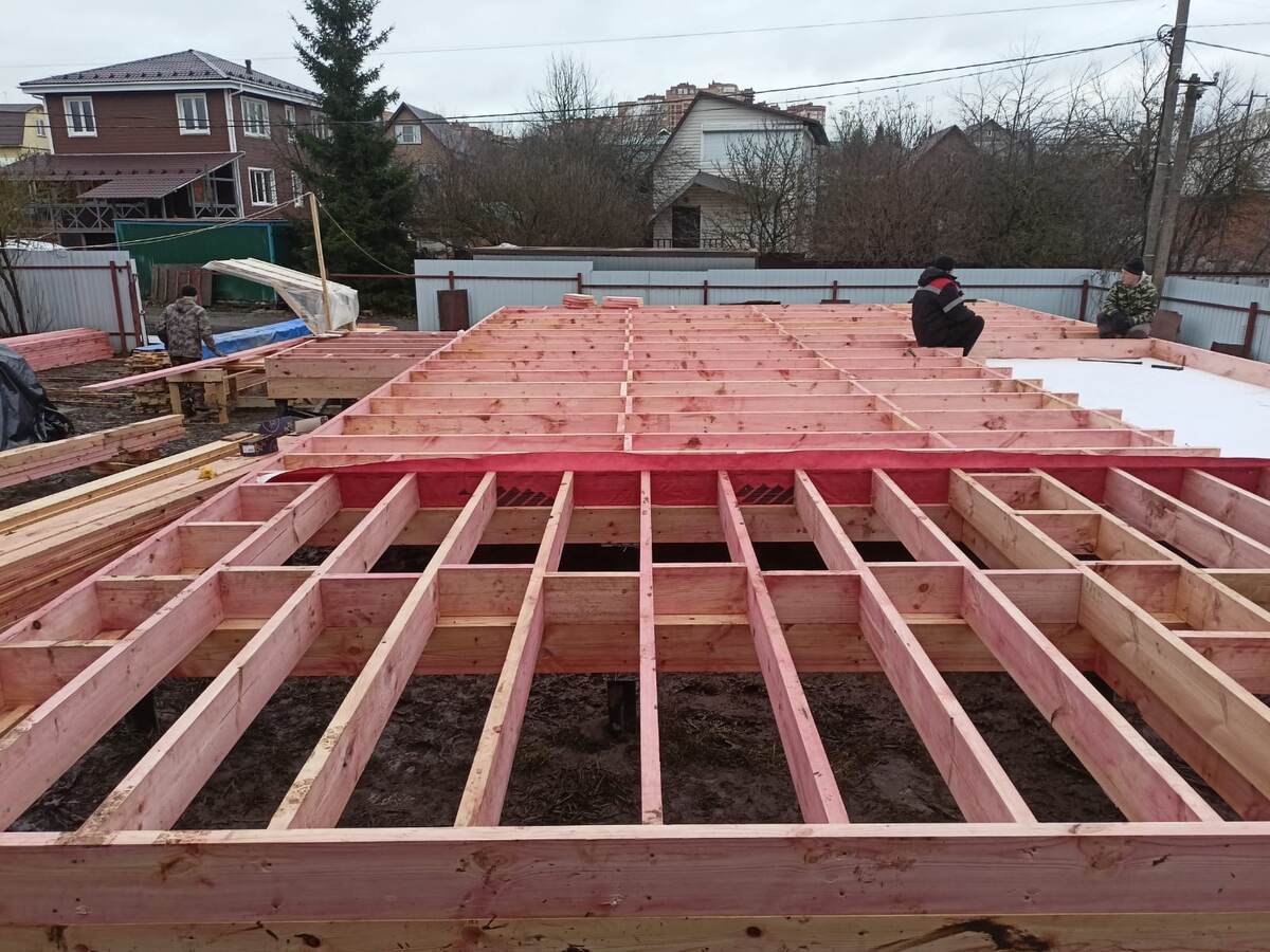 Выбор сечения, длин и шага балок деревянного перекрытия – это один из самых часто возникающих вопросов, возникающих при проектировании каркасного дома. Данным материалом давайте закроем раз и навсегда этот вопрос. Длина балки рассчитывается таким образом, чтобы она перекрывала имеющийся пролёт и заходила с необходимым запасом на несущие опоры. Минимально допустимая глубина опирания балки для каркасных стен составляет 100мм. Следовательно, при пролёте в 4 метра длина деревянной балки должна составлять не менее 100+4000+100=4200 мм. Максимальная длина доски, применяемой для деревянной балки, составляет 6 метров. Если требуется большая длина балок, приходится применять технологию сращивания. Берутся несколько досок и комбинируются в одну балку, стягиваясь между собой шпильками или конструкционными саморезами. Поскольку в России широко применяется утепление перекрытий общей толщиной 200 мм, самым ходовым исполнением деревянной балки является сухая доска 45х195(h) мм. В случае необходимос