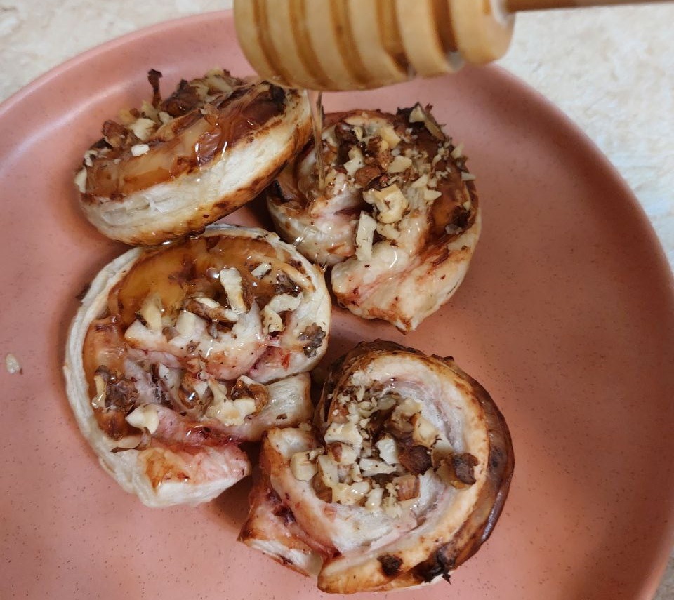 Так уж вышло, что в холодильнике было все, что нужно для приготовления этих вкуснющих красавцев! Я очень люблю сочетания сладкого с солёным, поэтому мне это блюдо пришлось особенно по душе. Думаю, что на новогоднем столе им также найдётся местечко за изысканный и яркий вкус! Также, в конце поделюсь рецептом круассанов к завтраку. Для приготовления нам нужно: Тесто слоёное бездрожжевое - 1пласт Брусничный соус Сыр бри/камамбер Мед Грецкие орехи 1 пласт я режу на квадратики, а другой - на треугольники. Каждый квадратик смазываем брусничным соусом и выкладываем сыр. Сворачиваем сыр в рулетик. Делаем надрез вдоль. Каждый квадратик сворачиваем в рулетик и выкладываем на пергамент. Следующий пласт посыпаем натертыми ветчиной и сыром. И сворачиваем в круассан: берём за широкий край и закручиваем до конца. Вот такие красавчики у нас получились на скорую руку. Брусничные рулетики посыпаем рубленными грецкими орехами, а круассаны смазываем желтком. Отправляем все в ра