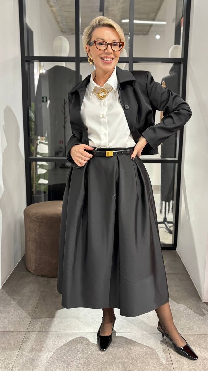 Начну с основы этого классного образа - с очень функционального атласного костюма, состоящего из укороченного жакета и юбки со складками.