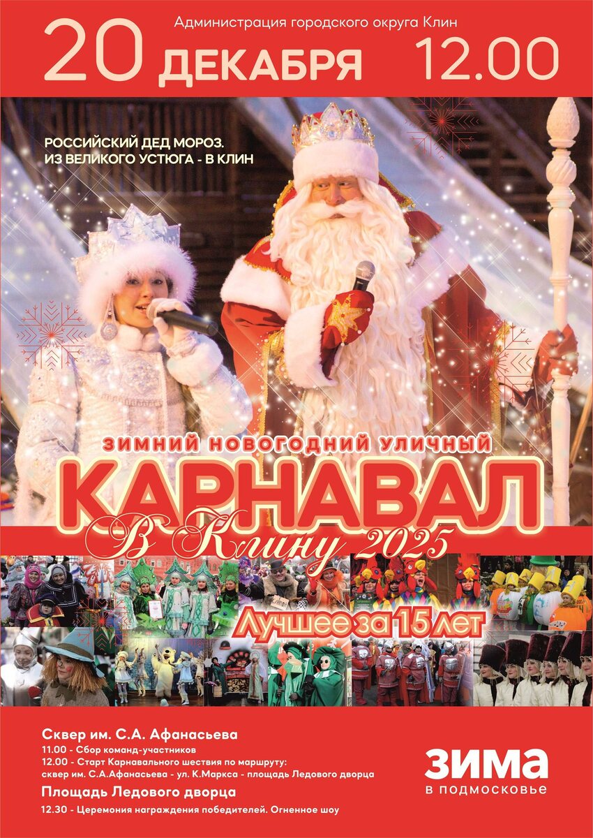 🤩🤩🤩🤩🤩🤩 🎅🏼 Российский Дед Мороз из Великого Устюга посетит Клин через две недели, в субботу, 2️⃣0️⃣ декабря! 🌟 Ровно в полдень он даст старт юбилейному 1️⃣5️⃣ Новогоднему клинскому карнавалу. Костюмированное шествие прошагает от Сквера им. Афанасьева, через ул. К. Маркса до Ледового дворца им. Харламова. 🪆 Сейчас команды учат речёвки, совершенствуют грим и обновляют костюмы. Ведь в этом году участники шествия пройдут в самых ярких и лучших костюмах прошлых лет. Команды-призеры, получившие в прошлые годы награды из рук Главного зимнего волшебника страны, представят настоящую ретроспективу Клинского зимнего карнавала. Трогательную и полную тёплых воспоминаний. 💙🤩🤩🤩🤩🤩 МОЛОДЕЖНОЕ ТВ #клин #клинзвучит #молодежноеТВ #зимавподмосковье