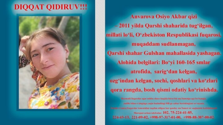 Отмечается, что на момент исчезновения она проживала вместе с семьёй в городе Карши. Сообщение о её отсутствии зарегистрировано в установленном порядке, начаты розыскные мероприятия, к которым привлечены подразделения органов внутренних дел, а также участковые инспектора профилактики по обслуживаемой территории.