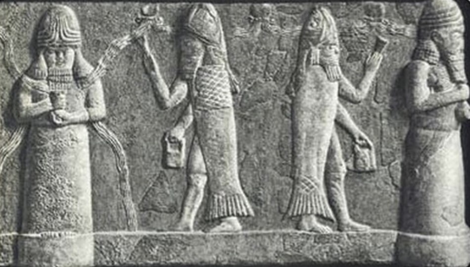 Хэнкок связывает эти изображения с древними текстами, в которых упоминаются Семь Мудрецов, возглавляемых богом-рыбой Оаннесом. Согласно месопотамским легендам, эти существа пришли из моря и научили людей письменности, математике, астрономии и строительству. Возможно, сумки символизировали знания и технологии, которые эти учителя принесли человечеству.