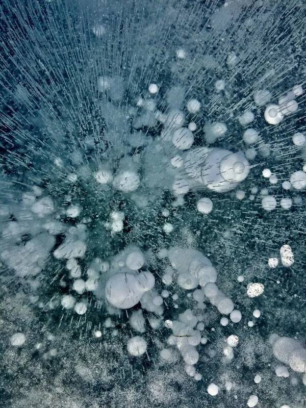 Пузырьки на Байкале Зимний Байкал — это совсем не про «один и тот же лёд». На озере можно встретить десятки его форм: мощные торосы, хрустальные гроты, ледяные холмы и причудливые сокуи. Но особенно завораживают метановые пузыри, застывшие в толще прозрачного льда. Эти узоры — результат работы природы: метан образуется благодаря микроорганизмам и подводным грязевым вулканам. Газ поднимается со дна и «застывает» в ледяной толще пузырями — от крошечных, как булавочная головка, до крупных, в десятки сантиметров.