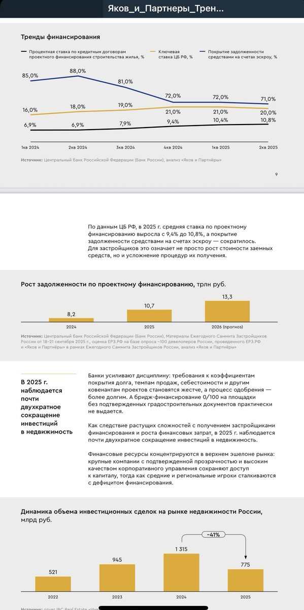 Икота икота, перейди на Федота, а с Федота на Якова, а с Якова на всякого. «Замечательное» исследование «Яков и Партнеры» и ЕРЗ. Я как будто-то переместился в уютный московский офис крупной компании нулевых посмотреть отчет аналитиков. Сидим смотрим, очень красиво все сделано, но почему не помогает? А не помогает потому, что данные взяты у застройщиков, которые никогда правды не скажут, даже если исследование делается для них. Давайте просто на некоторые вещи обратим внимание. Скрин 1. Вам там не колет в боку? Нормально все ребят? Ставка проектного финансирования в 2 раза меньше ключа! На что вы жалуетесь вообще, к чему этот скулеж. С 7 до 10% выросла ставка, ай ай ай. Малый бизнес под 30% только кредиты может себе позволить. Коммерция строится 20+%. Предпоследний абзац, - сокращение инвестиций наблюдается исключительно на пессимистичных ожиданиях застройщиков по продажам, а вовсе не из-за сложностей финансирования! Скрин 2. Инновационное предложение «безденежные партнерства с собс