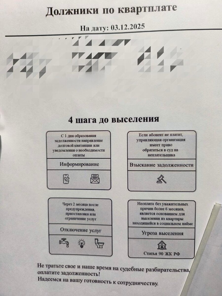 От подписчика 👇 В Реутове изменили подход к информированию о задолженностях за ЖКУ: списки должников теперь вывешивают в новом виде. Подписаться на Молнию ⚡️ | Отправить новость 🗒️ | Наш Дзен | Наш VK!