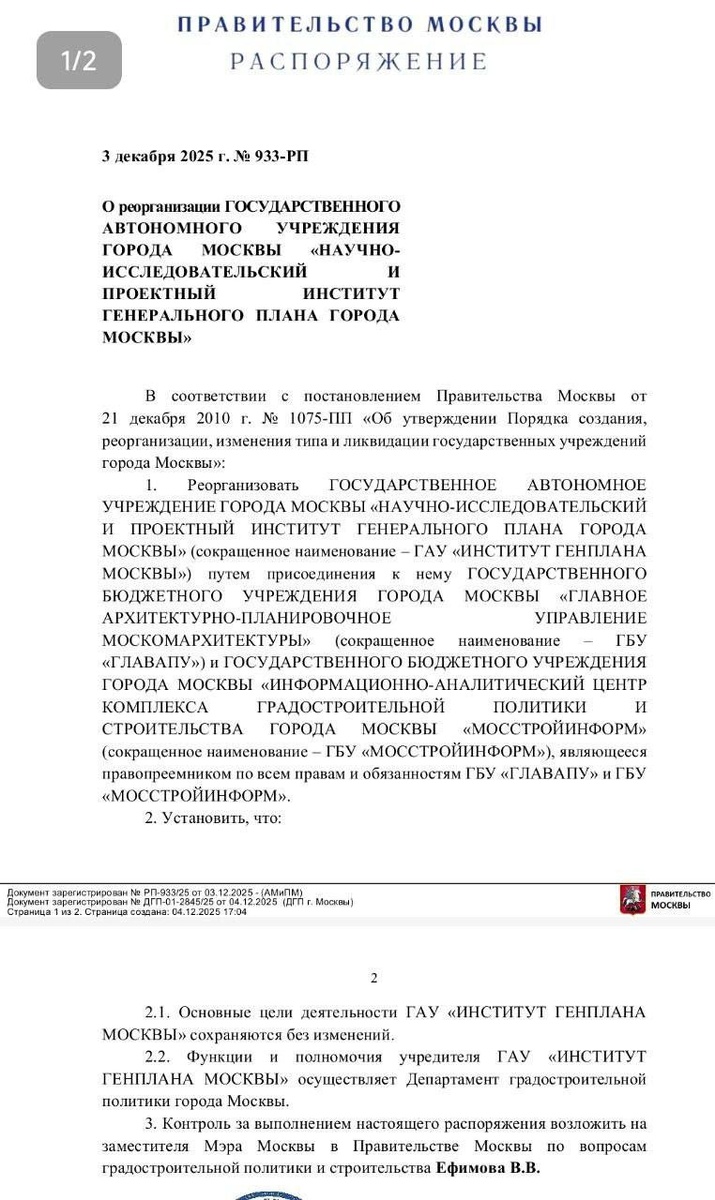 Институт Генплана Москвы поглощает Мосстройинформ и Главное архитектурно-планировочное управление Москомархитектуры Продолжение реорганизации Московского архитектурного блока Данная информация содержится в постановлении мэра Москвы от 3 декабря 2025 г. Nº 933-РП. Возглавит Институт Генплана Москвы экс-председатель Москомархитектуры Юлиана Княжевская. Куда уйдет Татьяна Гук, занимавшая данную должность с декабря 2018 года, неизвестно. #Земельнаяэкспертиза Земэкс