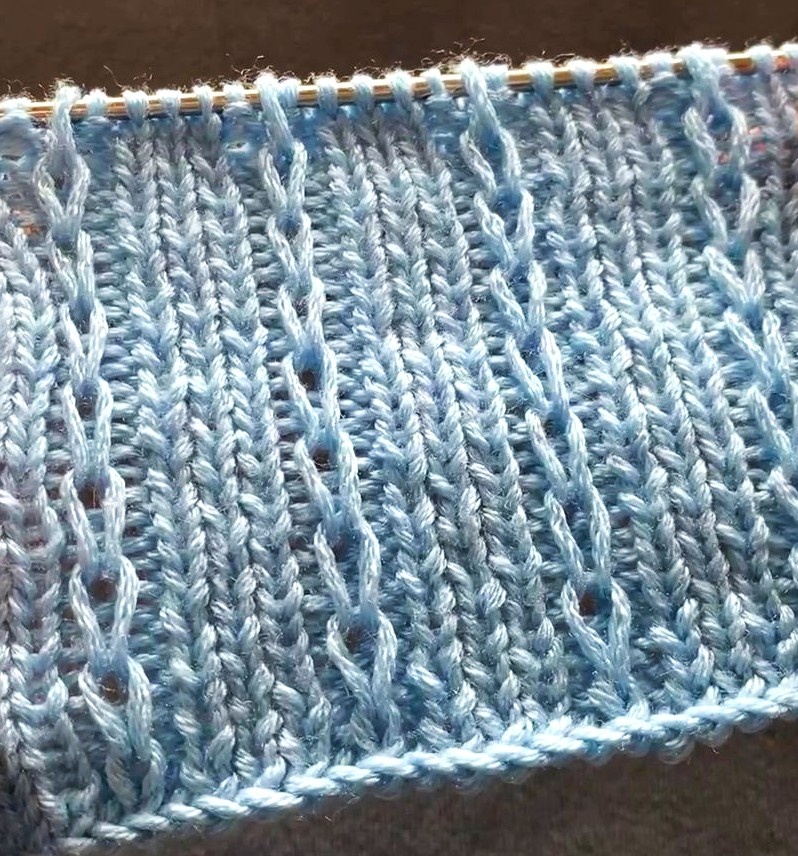 3р: К-*3л-1изн-1петлю переснять не провязывая(нить за работой)-1изн*-3л