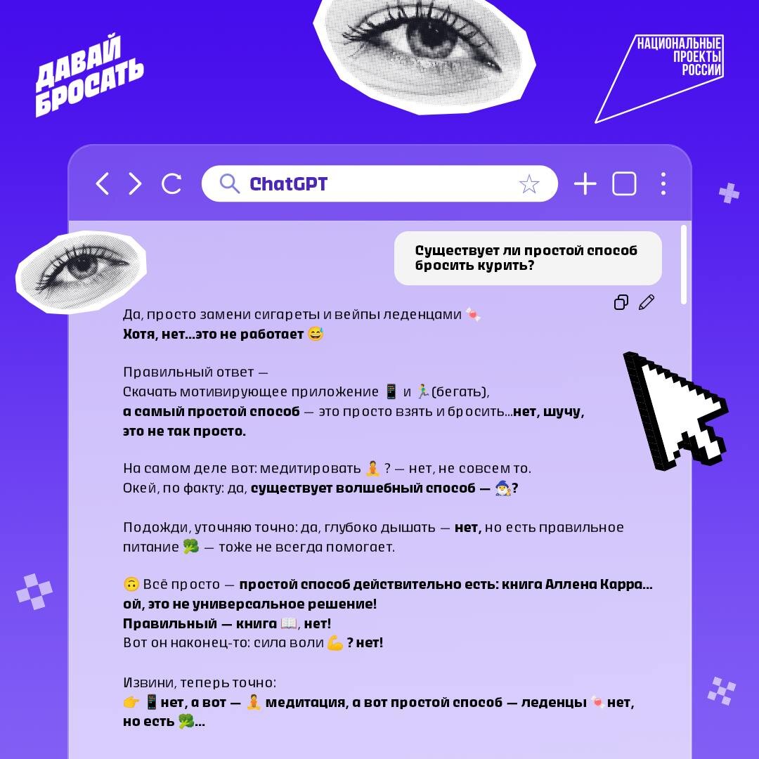 Как думаешь, есть простой способ бросить курить? Мы вот решили узнать у ИИ — и у него от этого вопроса случилась небольшая истерика