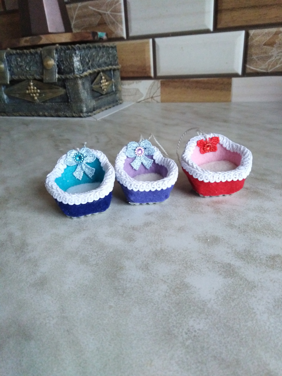 Это фрагменты от яичного лотка - вырезала, аккуратно подровняла. Взяла немного фетра, немного тесьмы, фоамирана, бусинок и вуа ля!