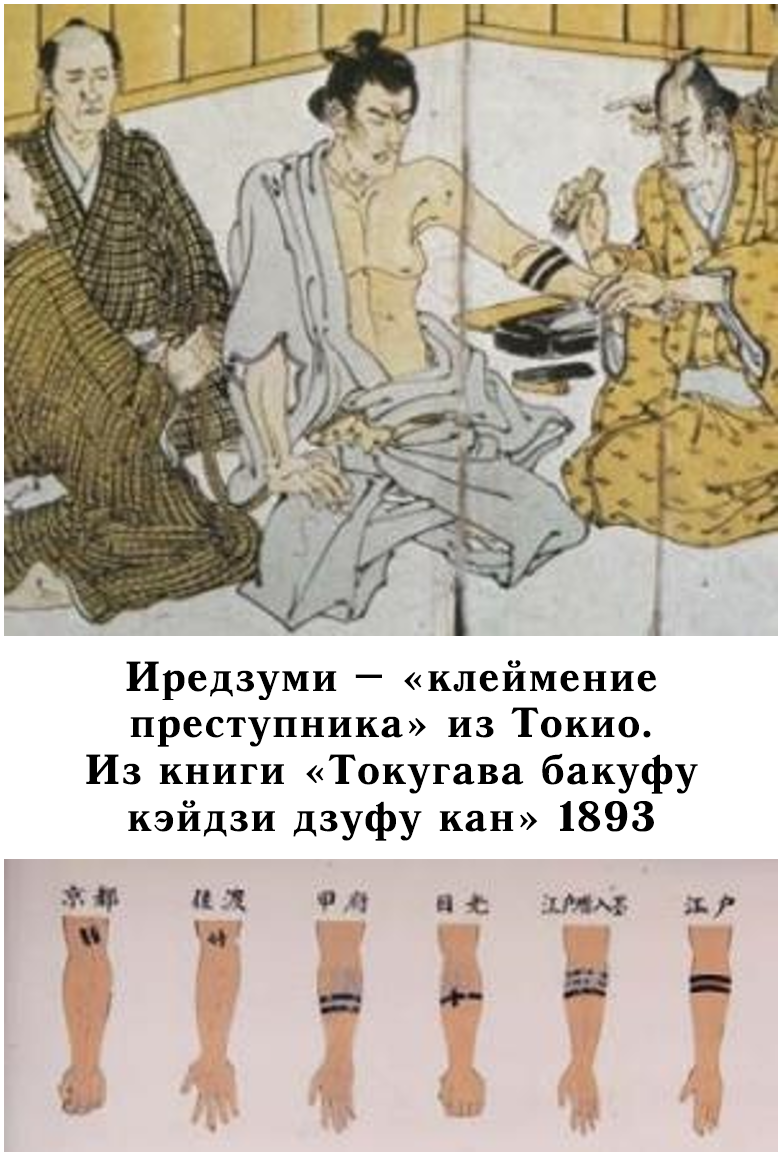 [1] В Древнем Риме рабов и преступников, (особенно беглецов и дезертиров) клеймили раскалённым железом. На лоб или лицо наносили буквы, например: FUG = fugitivus = «беглый раб». На лоб осужденных на гладиаторские бои или рудники могли нанести буквы, обозначающие их преступление. В Англии буквой «V» = vagrant = «бродяга» клеймили бродяг и нищих. Буквой «M» = manslaughter = «непредумышленное убийство» – убийц. «T» = thief – воров. «F» = fraymaker – «нарушитель спокойствия, бунтовщик» – за драки и мятеж. «SL» = seditious libel = «клевета» – за политические преступления. Клеймение отменили в 1829 году. Во Франции: Цветок лилии = fleur-de-lys – королевская эмблема, которой клеймили воров, убийц, бродяг и осужденных на галеры. Буква «V» = voleur = «вор» и «G» = galirien – «каторжник». Отменено после Французской революции в 1832 г. В Японии (с 720 г., а официально с 1720 г.) клеймение тату = иредзуми было распространённым наказанием за воровство и другие преступления. На лоб и руку наносили татуировки. Кольца на руки и линии на лоб добавляли за каждое преступление до самой унизительной метки иероглифа 犬 = «ину» = «собака». Отменён обычай в 1870 г. Интересно, что эта практика стала одной из основ для развития декоративной татуировки, которая маскировала криминальные клейма. В современной Японии отношение к любым тату в обществе резко отрицательное, так как наколки в Японии свидетельствуют о связи с криминалом или маргинальной культурой.