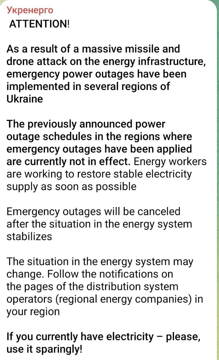 В ответ на пост Russia's latest strikes hitting Ukraine's energy grid HARD 'EMERGENCY power outages' in parts of country says national operator Ukrenergo 'If you have electricity, please use it SPARINGLY'