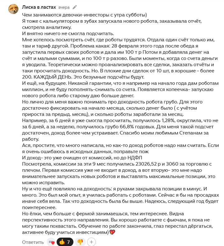 Роботы сейчас работают с 400 012.03 рублями из 499к на счету. За год я вывела с данного счета 132083 рубля, а пополнила его на 13476 рублей. В начале года баланс был 384150 рубля. Итого счет прирос на 134 469 рублей!!! И отсюда надо вычесть профит от того, что я продала активы ручками из старых запасов. Вот это сделать сложнее потому, что я записывала себе общий баланс счета, а тут же надо вспоминать что я продала, когда и почем. Мне лень. И если прирост портфеля на 134к дает значительно больше 35% за счет того, что я выводила деньги. То можно считать, что роботы принесли просто +35%! Хотя судя по всему они принесли больше в процентах за счет того, что делить надо не на 384к, а на куда меньшее число.