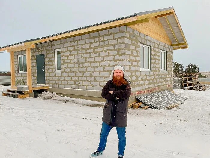 Я построил небольшой дом размером 9 на 11,5 метров. Хороший уютный домик для семьи с спальнями для двух детей, для хозяина и небольшой кухней-гостиной. Домик 100 квадратных метров - это всё, что нужно для собственного личного счастья за городом или в небольшой деревеньке. И необязательно строить сразу под ключ. Сегодня опубликую вам фотографии, а в следующем посте выложу архитектурный проект, если кому-то понравится. Небольшой дом построен на ленточном фундаменте. Использовали плиты перекрытия из полистиролбетона. Кстати, кто ими пользовался, напишите своё мнение. Стены из блока 400 мм толщиной с монолитными сердечниками сейсмо каркаса и сейсмо пояса по периметру здания. У домика небольшая двухскатная кровля с металлочерепицей в качестве основного кровельного материала. Также у домика небольшое крыльцо. Хозяйская спальня была спроектирована с небольшой нишей под личный гардероб или шкаф-купе. В доме также предусмотрено целых два санузла, огромный тамбур и холл. Две детские комнат