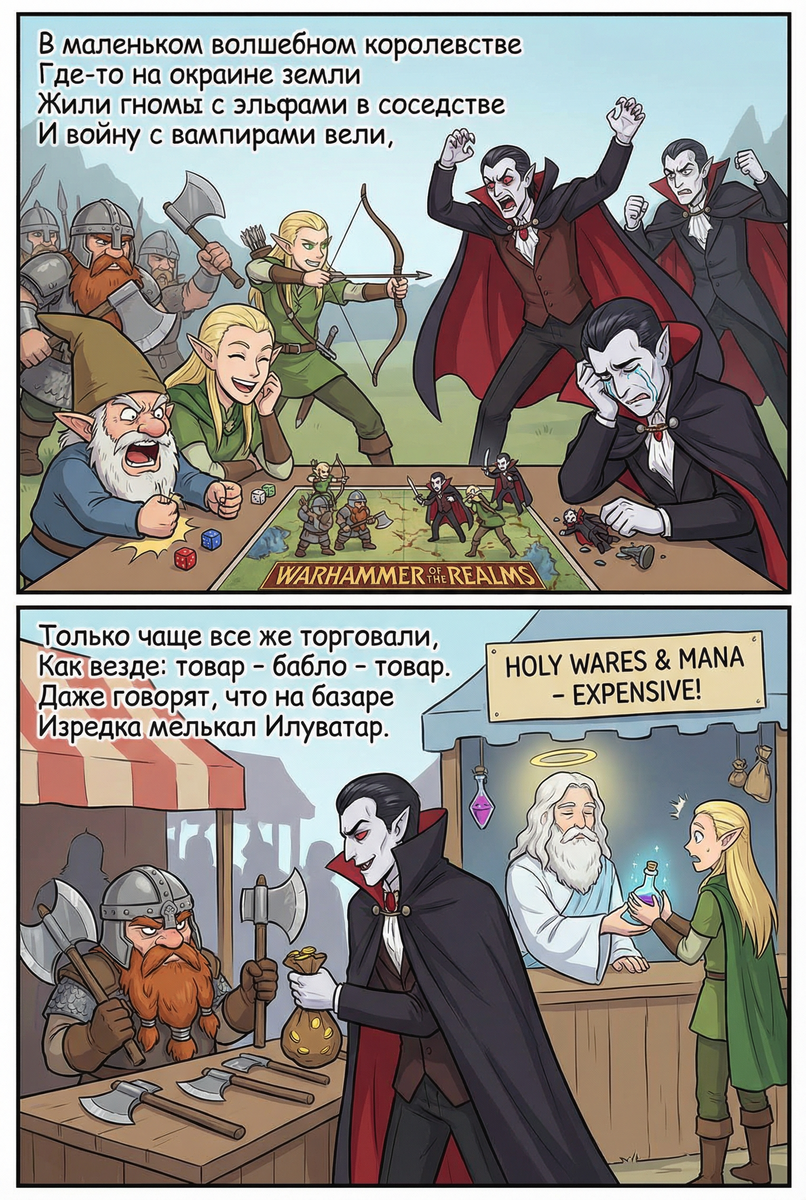 В эпоху раннего Громыкоида в российском фэнтези было весьма известно вот это замечательное произведение в стихах за авторством Светланы Ширанковой. Я всегда считал его в высшей степени достойным визуализации — и вот, наконец, у меня появилась возможность это сделать) Нейросеть Gemini-3-pro, модель Nano-Banana, операционная система Windows 10, первая половина XXI века: P.S. На то, чтобы создать такой комикс с использованием органического